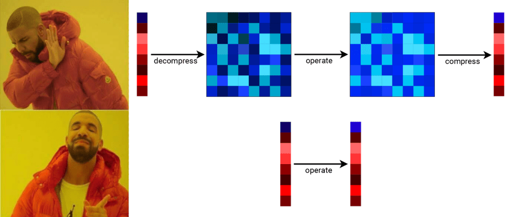 The main idea is that we’ve designed a compression method called PyBlaz that allows you to transform arbitrary-dimensional floating-point arrays (often called tensors) in certain ways without decompressing them. These transformations include negation, addition, mean, variance, L2 norm, and structural similarity index measure, all in at most logarithmic time with sufficient threads. It’s important to note that there’s no matrix multiplication and no element-wise multiplication (Hadamard product), so I’d like to urge you to not try to stick PyBlaz where it doesn’t belong.